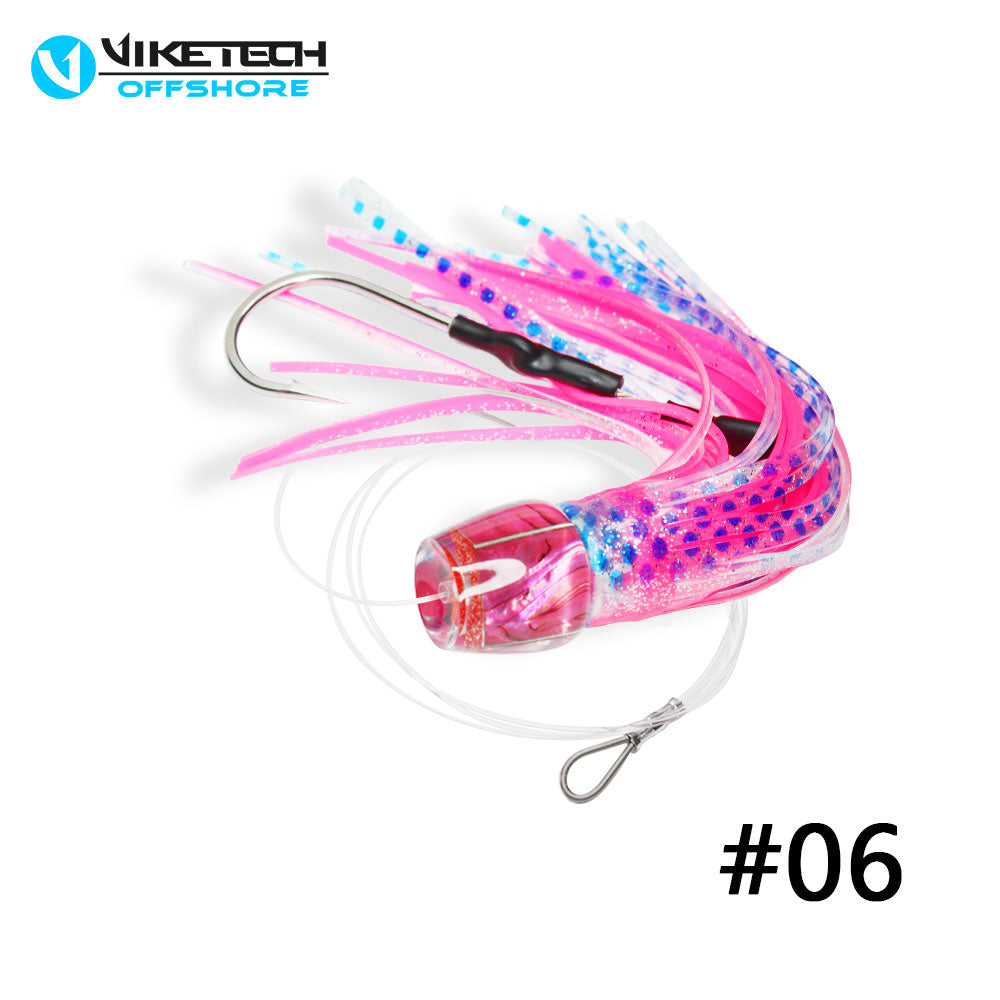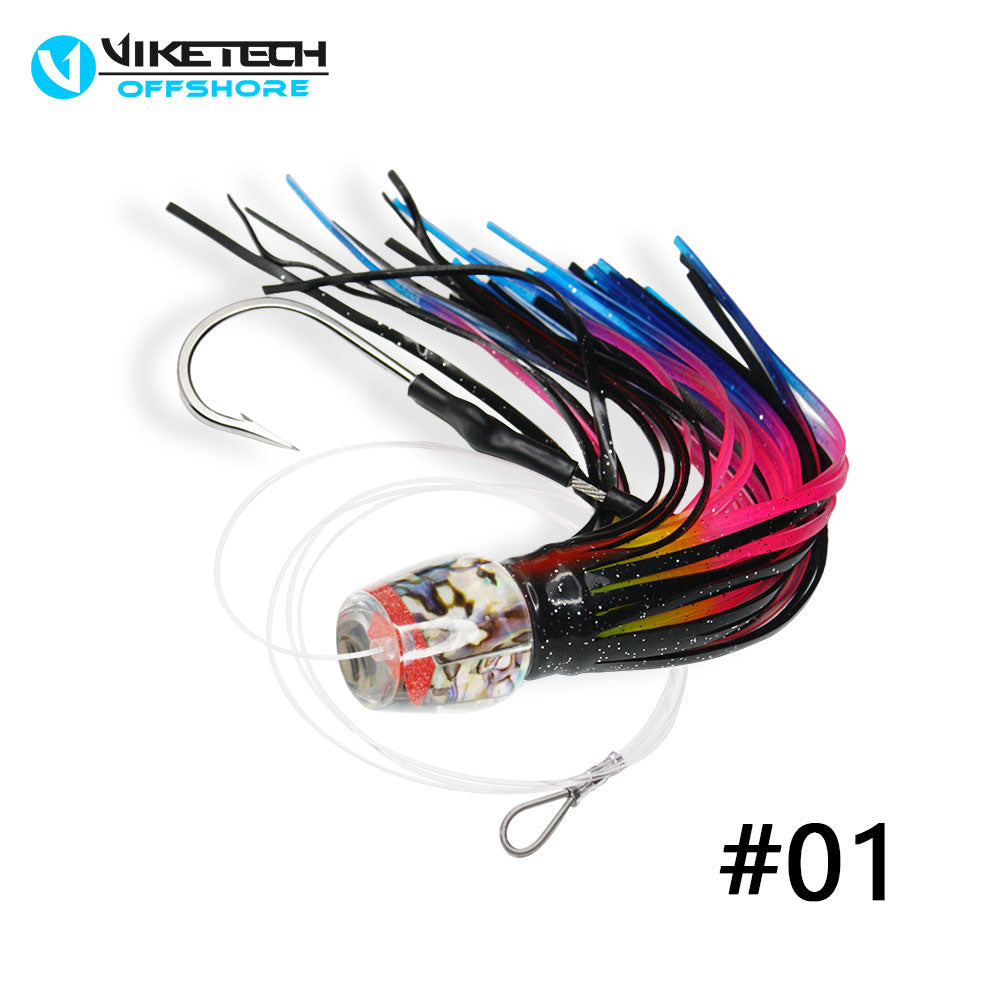 Pre-rigged on 5’ of 140lbs mono leader and stainless steel 9/0 single hookset.