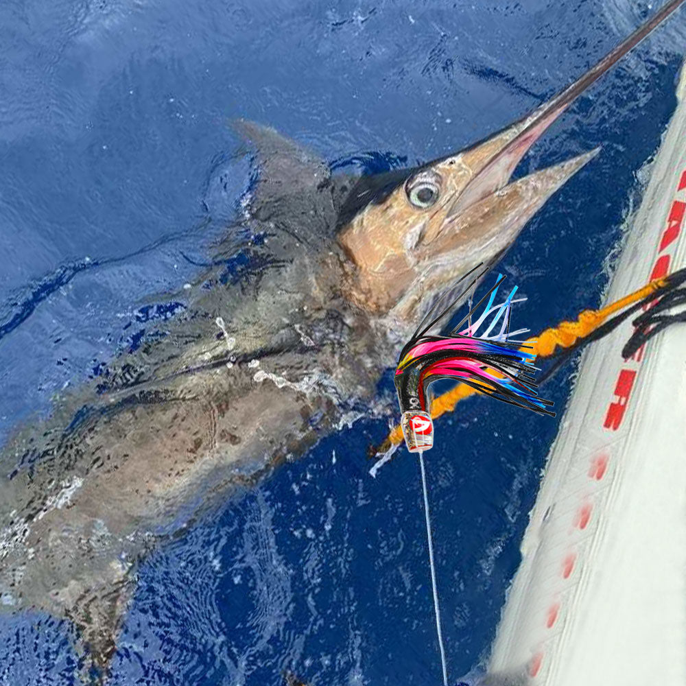 Pre-rigged on 5’ of 140lbs mono leader and stainless steel 8/0 single hookset.